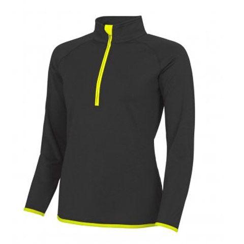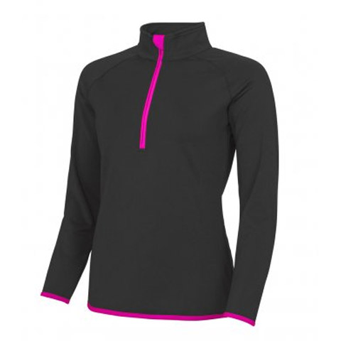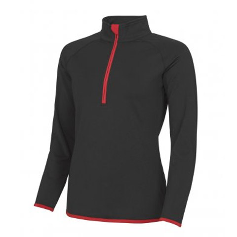 - Half front zip with chin guard.