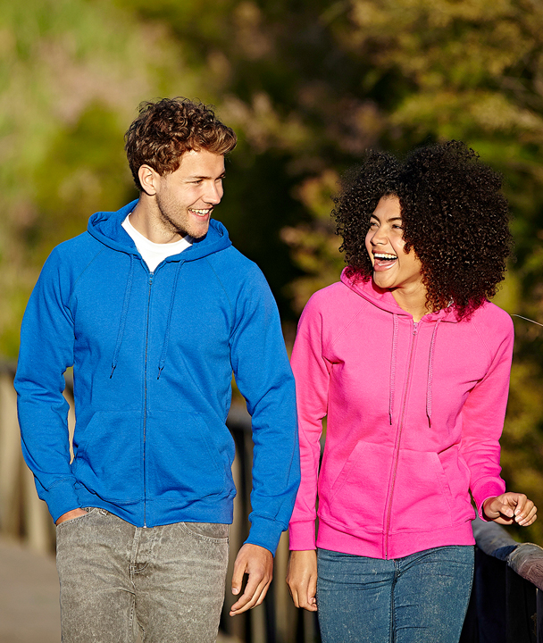 * Lightweight unbrushed fleece * Raglan sleeves * Hood with self-coloured flat draw cord * Covered zip for enhanced printability * Two Front pouch pocket * Waist and cuff in cotton/Lycra® rib * Produced using Belcoro® yarn for a softer feel and cleaner printing process |
